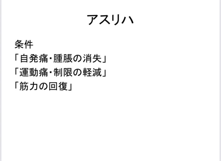ベースとしては病院のドクターなど医療機関のGOサインでアスリハに移行します。が、一定の基準として
