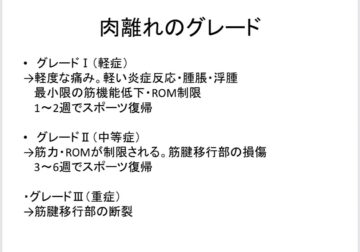 →肉離れは重症度によって大まかに3つのグレードに分けられています